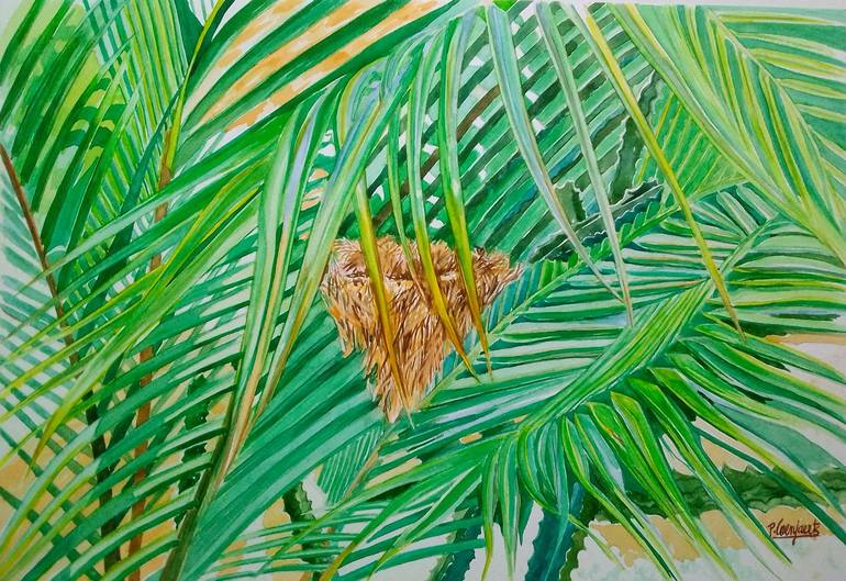 A nest in a palm tree. Strings, Stripes and twigs, woven in light and more light and overlaps. Boxing in, as interacting in protecting the delicate creaturas.