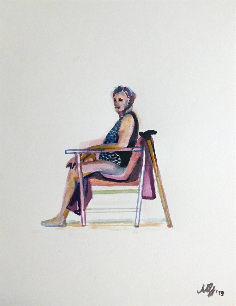 An elderly woman is sunbathing on the beach. Never too late too enjoy life.