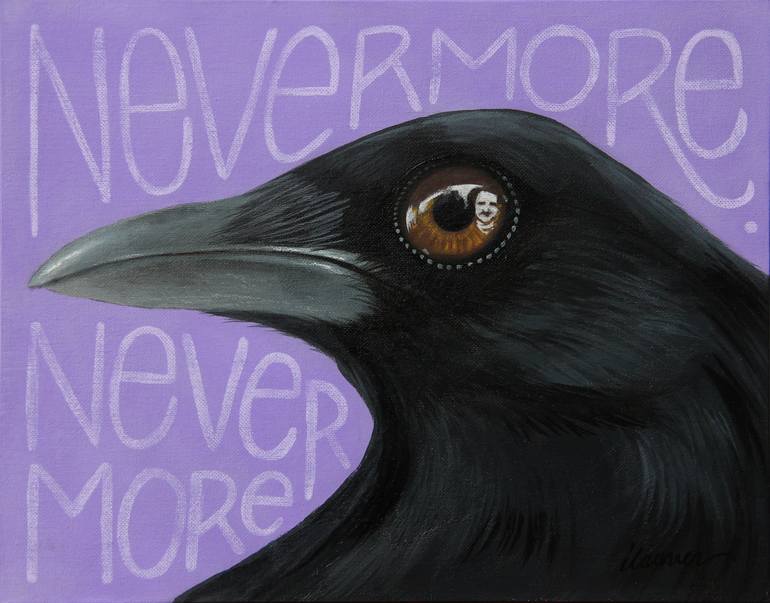 2023 / Acrylic and graphite on canvas panel. New contemporary painting of a raven with Edgar Allan Poe's refection on the birds eye. The background shows the words "nevermore, nevermore".