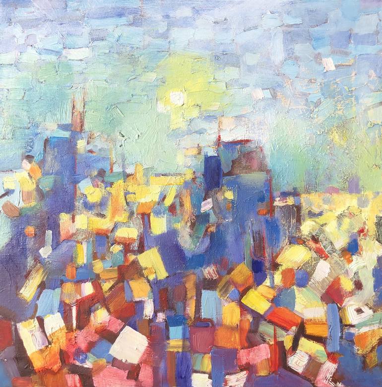 Elena was born and raised in Moldova, but in the last 30 years she has lived and worked in UK. Her work exists between the real and the imaginary, representation and abstraction. Elena’s paintings explore beauty, chaos and predictability of urban landscape built up gradually over time. Some cityscapes are derived from her travels and firsthand observations, and some are from images found on the internet, mirroring how specific locations are drawn together by their similarities, which are surprisingly bigger than the differences. Elena combines traditional painting techniques with less conventional methods: laser etched drawings and grid-system structures applied over pre-painted surfaces. Through the rendering of colour, texture and composition, she focuses on atmosphere, memories and connections. Main influences on her work at the moment are early Cubists, Pavel Filonov, Rauschenberg, Mark Bradford, Lars Elling, Deborah Tarr, Paul Noble,