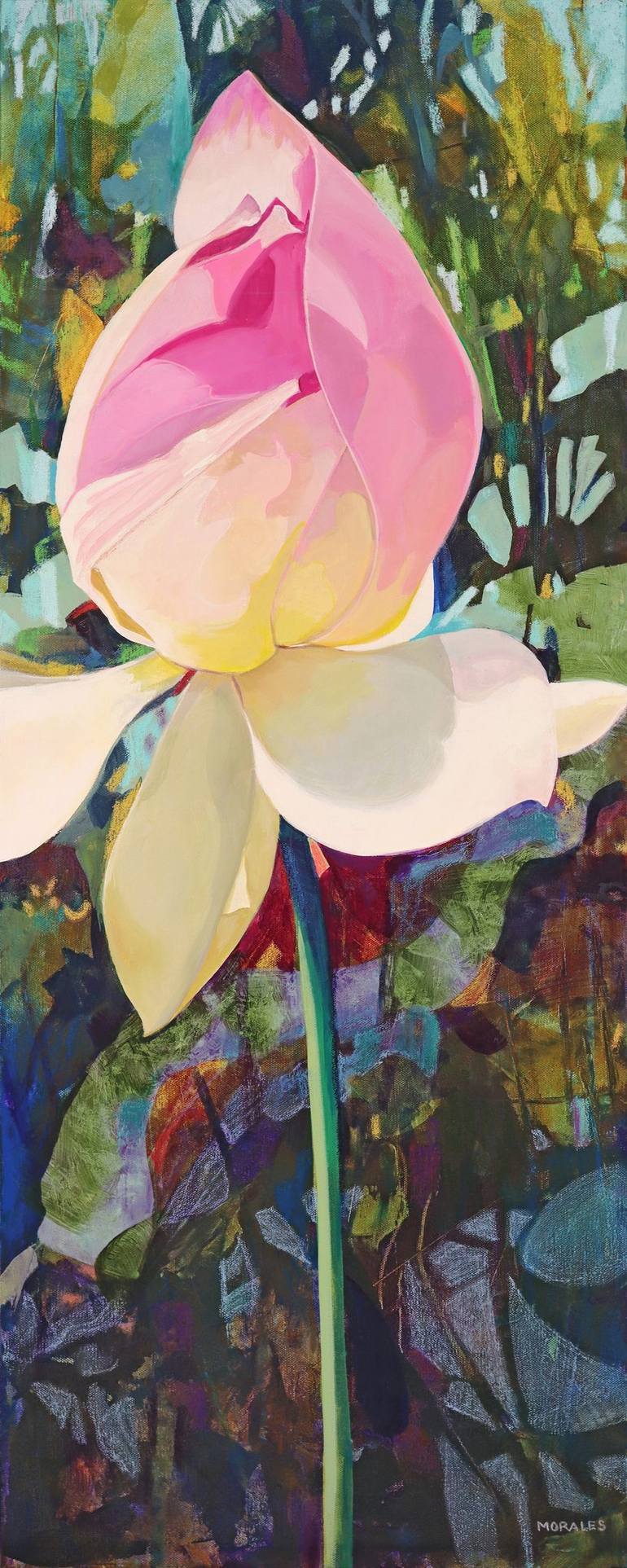 Inspired by photos I took of large blooming water lilies, combining realism with an abstracted, stained glass looking background. On gallery-wrapped canvas with the painting extending around the sides. Wired and ready to hang.