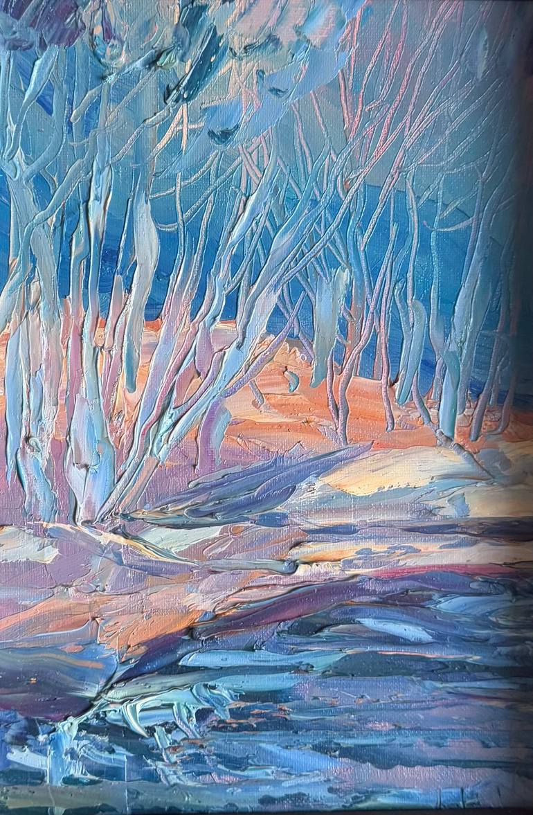 This painting depicts a winter forest, where the crisp air intertwines with the glow of the evening light. Bold brushstrokes capture the texture of snow on the ground and branches, as well as the movement of the water reflecting the last rays of the day. The evening light filtering through the trees...