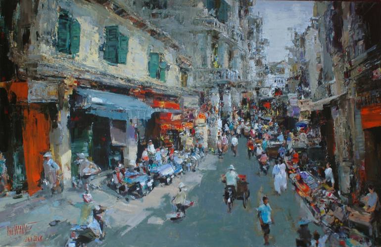 Nguy Dinh Ha was born in Bac Giang, North Vietnam in 1979 and had a childhood with friends and family in his countryside. Through phases in his life, he had been fascinated by art. The interesting was cultivated and further developed when he opted to take his Bachelors Degree on Art in Vietnam Fine Arts University. In learning time, he went to Ha Giang for doing exercise in two months. And this time, his love to ethnic people was bloomed. After graduation, Ha decided to create artworks about ethnic people in oil on canvas as his main stream. He delved even more into skills, also people, uniforms, culture of them. Besides, he also created some artworks about his childhood – countryside with buffalo, paddy field, bamboos. And ancient streets in Hanoi – his current living place. He chose for himself a different way, It's about "Love". He wanted to show people see things around how much good and lovely. A smile could make a good thing, a crybaby could make a love... People told him: "Your artwork is so colorful". In his opinion about painting, each color represented a human's factor: Blue, Red, Purple, Yellow, Black, White... When each color stood alone, it was clearly a difference, but when they was combined, it brought to us a colorful world. Only love could make that thing. Without love, mankind couldn't make the best things to themselves.