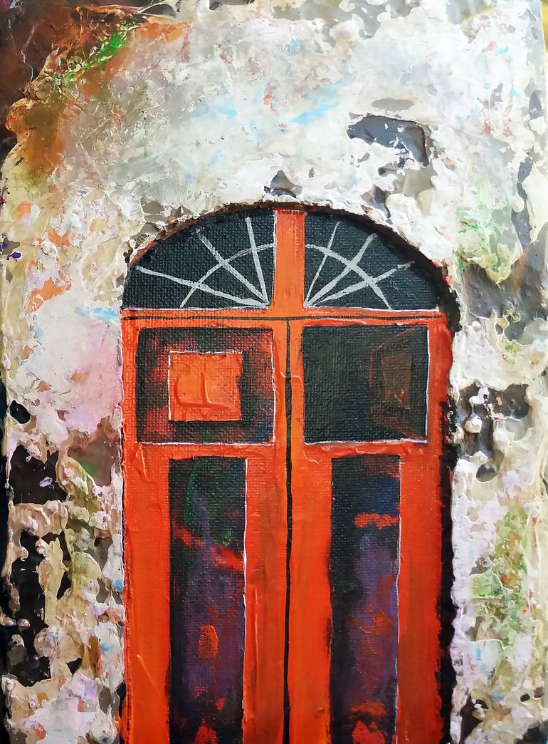 Colonial Gateways Series An ordinary door painted in shades of brown stands against a dirty old wall that is skillfully thatched with green smudges to represent potions of dampness and algae. The door itself is beautifully sketched to appear damaged and exposed to the outside in complementing its b...