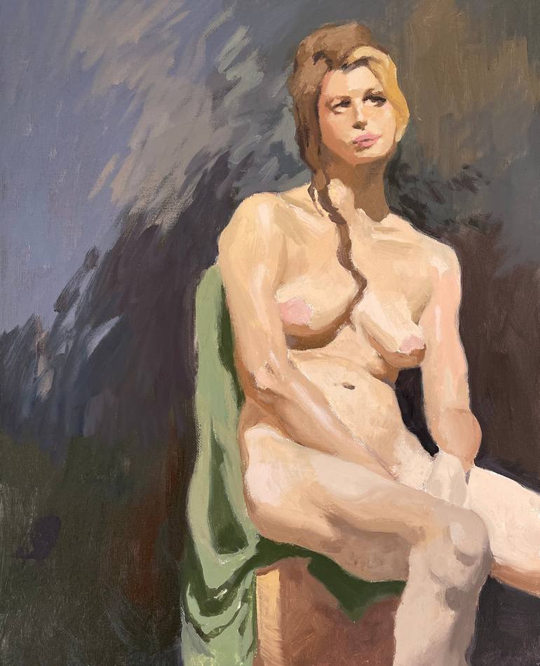 A woman sits with the slightest smile as she gazes outside of the view of the painting. A dark and indistinct yet energetic background frames the figure.