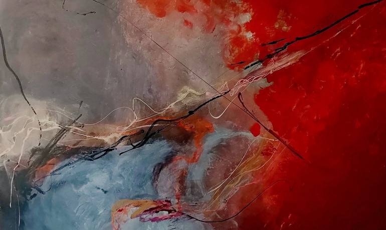 The explosive red in the painting is both bright and deep, contrasted by a cool, light blue which brings out the dynamic of the nife fire. The laquer streaks might remind the viewer of the flow of rare elements, which spread over the material like spidery roots of organic origin. The vitality of "...