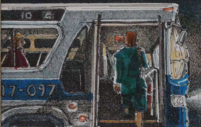 Original watercolour/ink on paper Painting size - 4" x 6" Framed size - 12" x 14" Night in the city. The bus comes, a lady gets on, the bus goes...