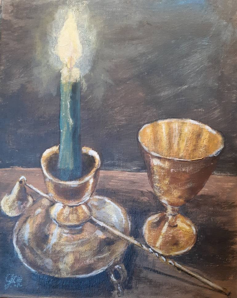 My wife has many figurines, candle holders and metal cups on display in our cupboards. Arranging these three objects struck my eye, so I decided to create the painting. It has a certain nostalgic atmosphere.