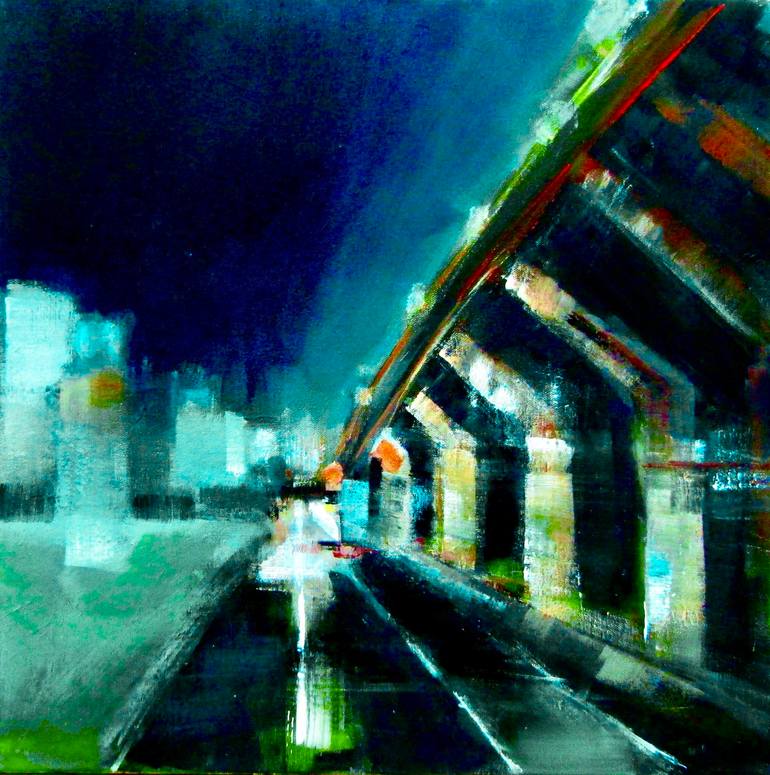 I interpret the natural world and the built world, through colour and paint. Depending on my mood and the season - I love to paint local scenes in a semi abstract style - the motorway or the canal, or perhaps the river. Preferring to paint a broad range of subject matter, I find different views and objects require slightly different ways of working, I enjoy all these aspects of painting. Most of my work is semi abstract and painted in layers with acrylic paint, and sometimes wax or oil paint on the surface. The tangle of nature is always uplifting to paint and perhaps the motorway is a less obvious choice, but at night when the lights bounce around on the tarmac it can be really beautiful.