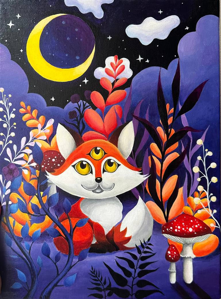 This artwork was inspired by fairytale style, and my love to the nature. It’s really something new to me, so short choice of the colours, which match so well with each other. I feel from this painting calm mystery, pacification, fresh forest air with fragrant smell of the herbs and plants.