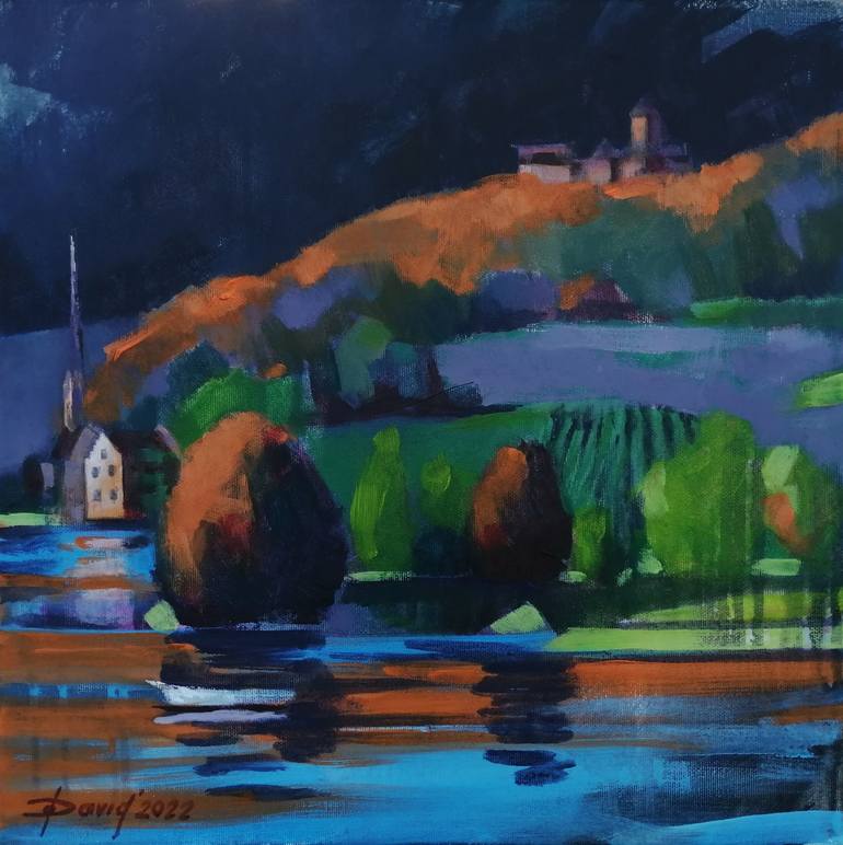 Stein am Rhein, view from the island Werd with the castle Hohenklingen in the evening sky. Evening pleinair, 40x40cm. Landscape painting. In love with Switzerland. Mixed media on canvas 40x40 cm, very decorative motif. The canvas is stretched on a wooden frame and can be hung immediately. Mounta...