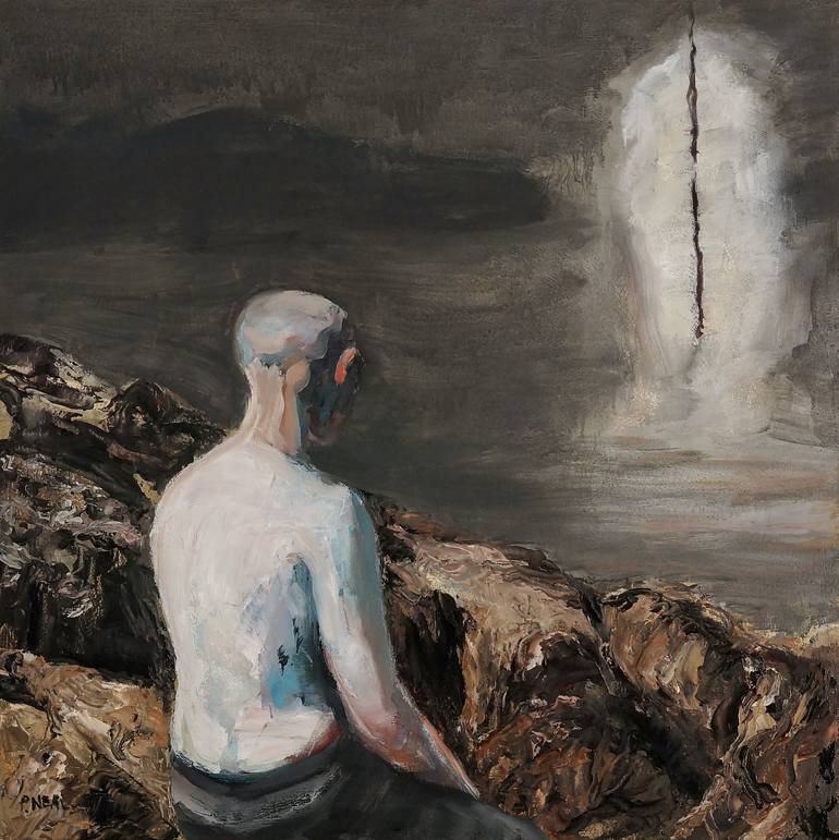 This is another painting in my series of lone figures in a dreamscape setting. Art for our times.