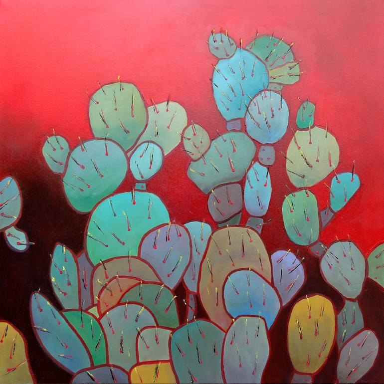Original painting, impressionism, landscape painting, oil on canvas, modern art, cactus. Blue, Red, Yellow, Turquoise, Green, Brown colors. Every painting is signed and comes with a Certificate of Authenticity and is wrapped carefully for shipment around the world to ensure safe arrival. The colors ...