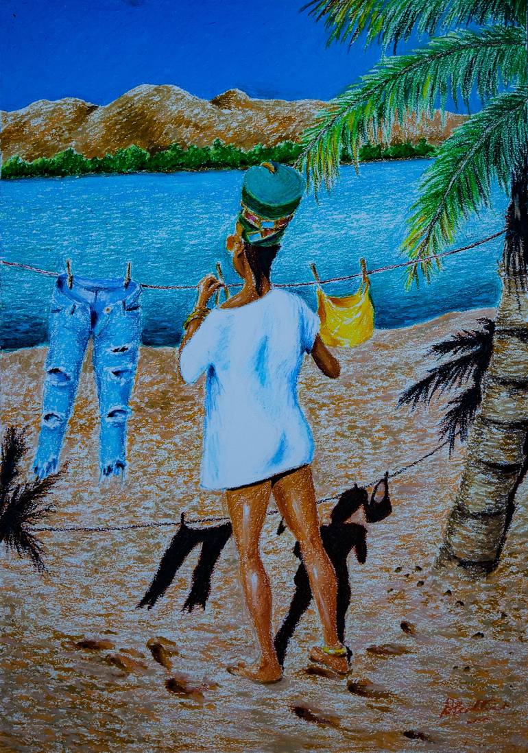 My earliest work in Indian ink and watercolour involved paintings of people's homes which I attempted to sell on the doorsteps of affluent Kensington West London.Happily they were all in easy walking distance of my own W8 hovel.In cold weather the owners sometimes brought me soup which I consumed while seated on the kerb,all very Dickensian. I performed a similar activity involving breweries.That is to say I was compelled to visit every hostelry between Edwardes Square in Kensington and Sloane Square in Chelsea,to this day it remains a blur in my memory.Yet not entirely so.I do remember encountering the author of Cider with Rosie when I was trying to sell a picture of The Roebuck pub in Chelsea to the landlord.Said author referred to the Roebuck as his 'office'. My chief desire was to illustrate books and my first three publishing commissions arrived on the same day,whacking out illustrations for three books at the same time was not without its problems. I mainly illustrated children's books for some of the big London publishers but after fifteen years of line and wash I decided to reacquaint myself with oil pastels. It took a further five years or more for me to become anywhere near proficient...this learning process continues. As to the present.I like bright colours and sunny days,I love the sun and heat of Egypt.Oil pastels (the best ones,there's only one brand)seem to get it done for me in terms of colour and application. My pictures may appear on the wild side,I can assure you are measured to the inch,hence my reluctance to chop bits off to accommodate the recent prints crisis. In terms of content,my contemporary female forms crazily intermingled with figures from the 1920s(the era of the great Tutankhamun discovery)contain the essential humorous element for what are meant to be fun pictures. Ancient Egypt providing the most spectacular imagery and the best hats.