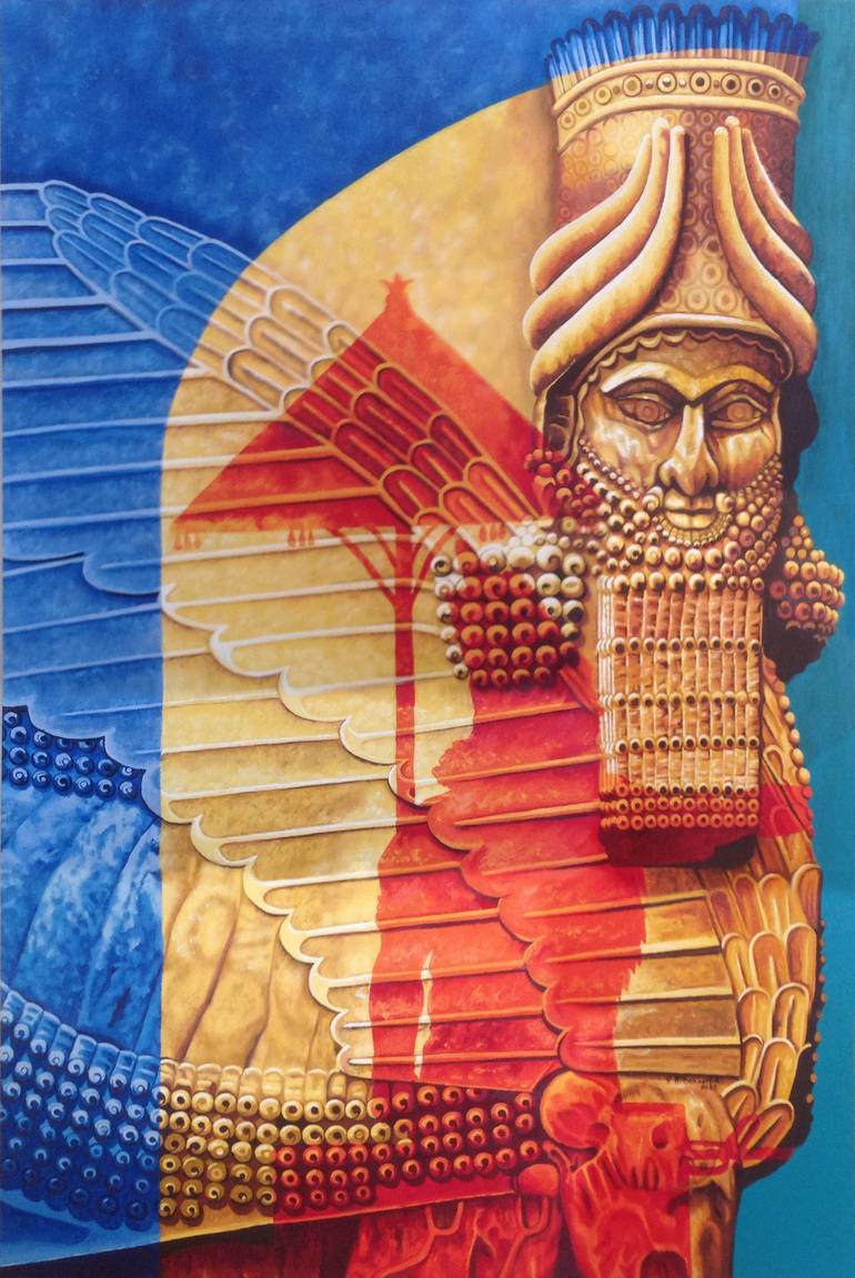 this painting is oil on wood, cover in resin. After witnessing on the internet the destruction by isis of cultural artifacts in Nineveh. I decided to make a painting honoring the Assyrian Culture.