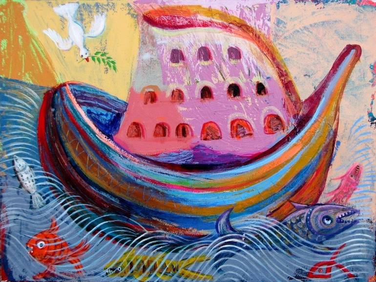 Noah's Ark, Acrylic on canvas,39x29 The Boat (Arch) stands as a symbol of Christ's Church, which will remained untouched and safe in any weather and storm conditions, the waves symbolizing the peripeties of life, which are always unstable and harsh and the fishes are demons, who searching for the fo...