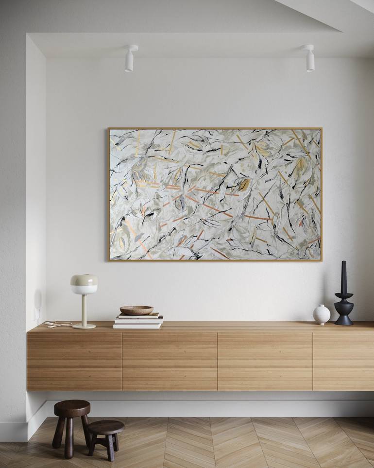 Nobody Can Stop Me is a striking large abstract painting that brings dynamic energy to contemporary interiors. The light color palette of soft whites, neutrals, and pale beiges provides a soothing backdrop, while bold gold leaf details add movement and vibrance. This artwork embraces endless possibi...