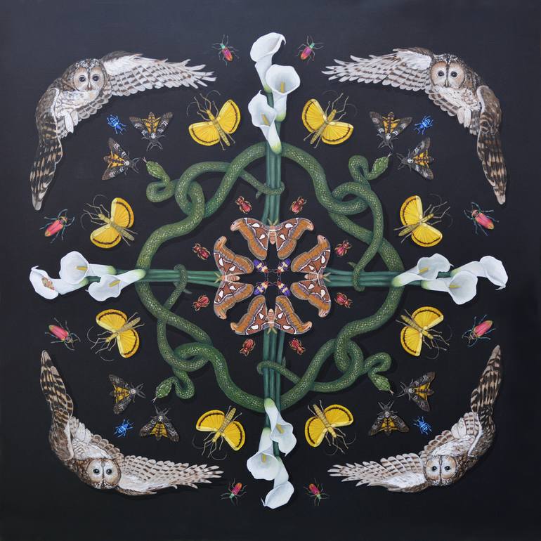 Hisham Echafaki is a self-taught painter with a fascination for nature and the animal world. Working in oil, acrylic or resin, his work focuses on surrealist compositions with animals and examines the impact that humankind exerts on the environment´s fragile balance. Whilst his artwork evokes a sense of wonderment for nature’s colours and patterns, it often incorporates anthropomorphic and ‘trompe-l’oeil’ features that engage the viewer to reflect on our complex relationship with the animal world as well as the importance of conservation and protection of the planet’s rich diversity. Hisham Echafaki also creates three-dimensional animals painted on multiple layers of resin to give the optical illusion that they were once real specimen. Presented as faux taxidermy the creatures often display anthropomorphic features on their wings or bodies with recognizable patterns found in art, design, science or architecture while others are simply more lifelike. Each piece is a tribute to the beautiful intricacy and complexity of the animal world but also a critique of how humans are affecting and shaping evolutionary changes in animal species. It also questions the ethics of keeping animals in captivity as ornaments or for our personal enjoyment.