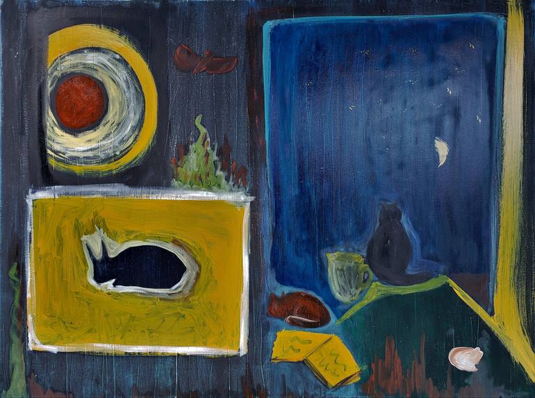 This artwork is an abstract painting divided into distinct sections with a dark and moody color palette. The left side features a circular motif with concentric circles in red, white, and yellow within a dark background. Below it is a rectangular yellow section with the outline of a black cat curled...
