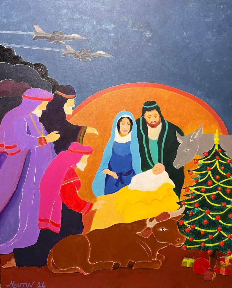 La crèche de Noël pendant la guerre avec des bombardements par des avions