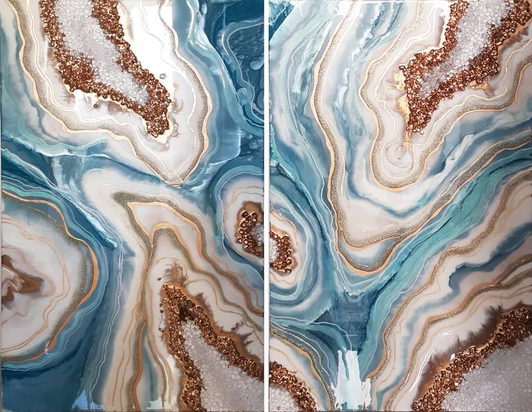 Since childhood, I adore minerals and precious stones, their splendor and bizarre shapes and color combinations. As a child, I lived in the Urals and often found various minerals in the mountains. I just want to convey my admiration for nature. Multiple layers of epoxy resin, glass, crystals, gold ...