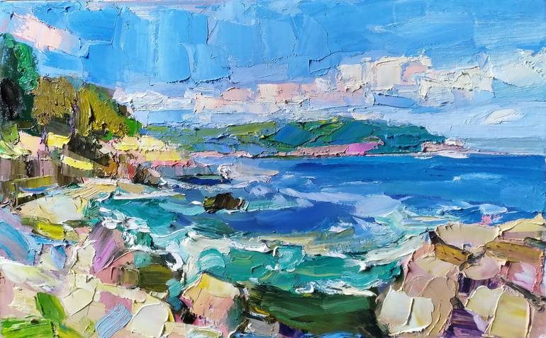 Original oil on canvas small landscape painting stretched on a wooden frame. A plain air atmospheric study was finished in the studio. Impressionism. The master-quality material has been used. Heavy impasto builds with brushes and pallet knives. Edges of the painting are covered with archival whit...