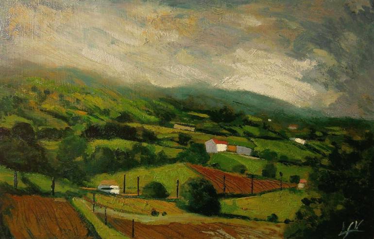 Landscape painting inspired by my trips to northern Spain. Depth: 3 mm. Unframed painting mounted on a white panel for sending to customer.