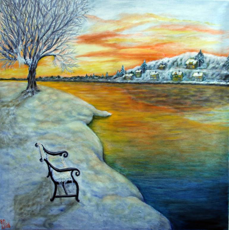 This original oil painting captures a colorful winter evening in Norway. It portrays the mood of a sunset as seen by a fjord. The vivid colors and soft textures evoke a serene and peaceful feeling, characteristic of the Norwegian winter landscape. The artist skillfully blends realism and expression...