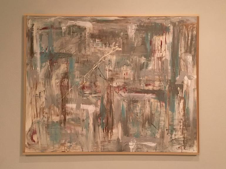 Large scale abstract mixed media painting on 1.5" gallery canvas with natural Poplar frame. Mixed media elements: acrylic, spray paint, house paint, wood stain, drywall mud and other leftover paints.