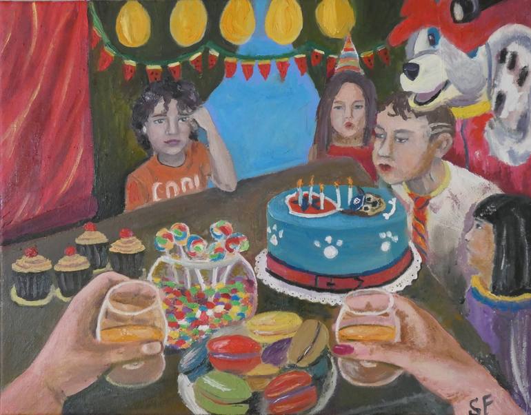 Once my child and I were invited to a children's birthday. It was a lot of fun, but when the birthday boy was blowing out the candles on the cake, my child had such a sad, sour expression on his face. Hence the idea to paint a picture is "Not my birthday". When children still do not know how to hide...