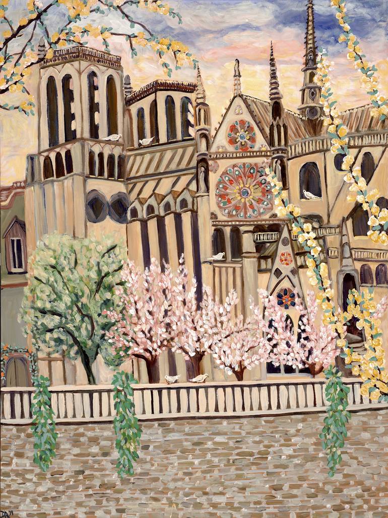 View of Notre Dame before the fire; with spring blossoms and doves.