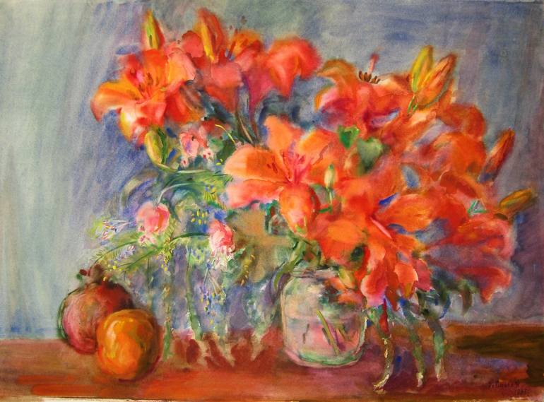 Very bright dynamic work of the artist. Lily often served ancient artists as a model for their artworks and ornaments, such as in the temple of Solomon The heraldic lily (royal, bourbon, fleur-de-lis) is among the four most popular signs in heraldry, along with a cross, an eagle and a lion. The ori...
