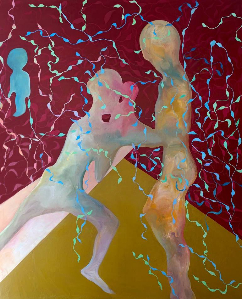 Nr. 103 Oil of canvas 150x180x4 cm 2024 This work is made of high-quality pure fine-grain linen canvas. The base material is a synthetic material of cellulose and glue, which has been painted 5 times and finely polished. The theme of the work is family. High saturation color contrast, color space...