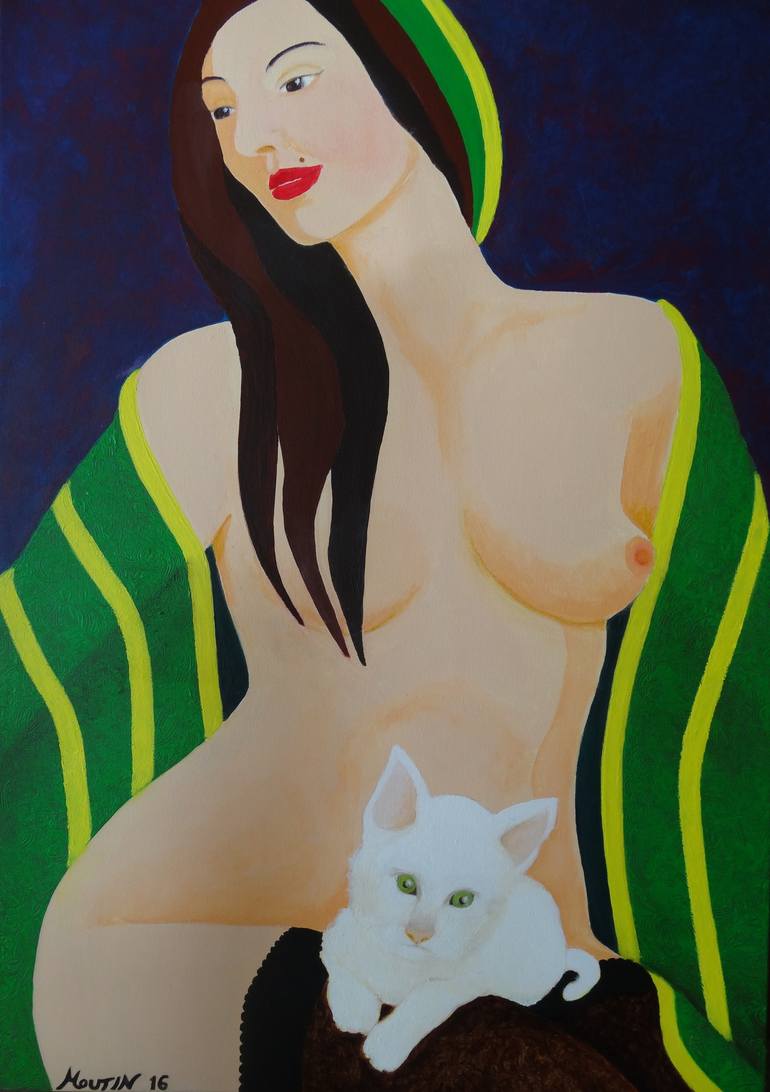Femme nue avec un petit chat blanc sur les genoux (Nude with little white cat)