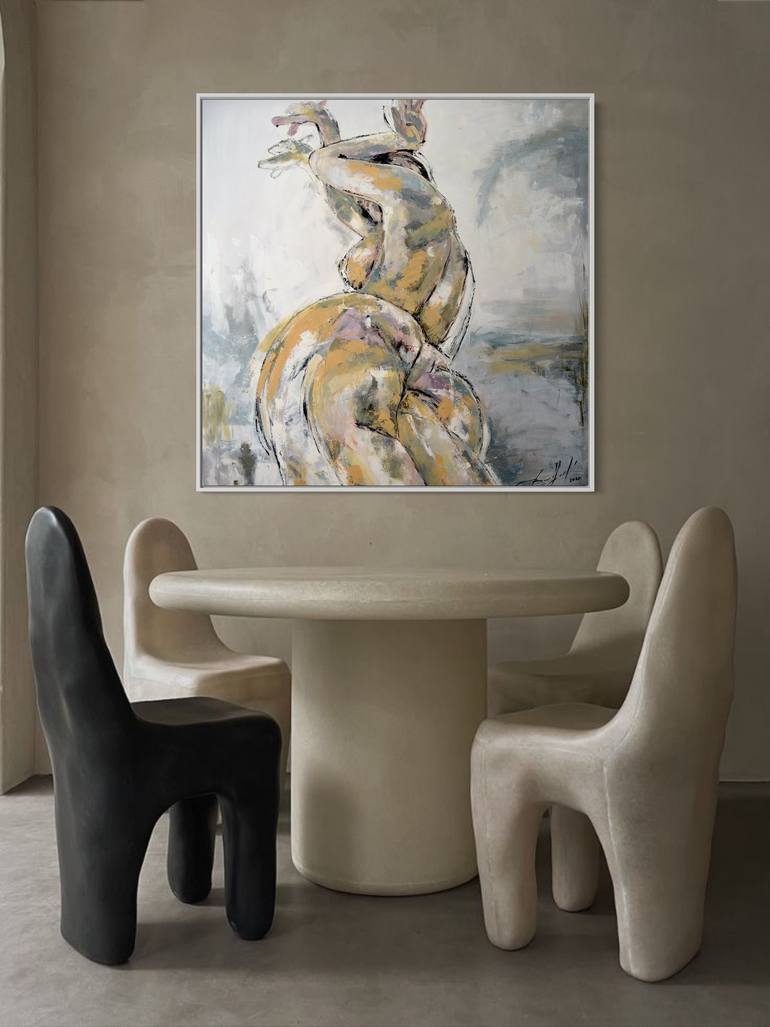A captivating oil-on-canvas masterpiece, the artist endeavors to convey a deeply emotional and evocative narrative through the use of an abstract, nude female figure. The palette of pastel beige, grey, white, and delicate hints of pink against a light background creates a striking contrast that adds...