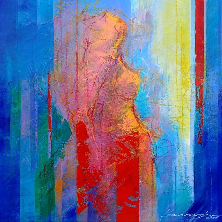 Female nude and mirror reflection painted with acrylic on canvas. Vertical lines and spots emphasize peace and elegance. Paint applied texturally, drawing with oil pastel. The sides of the painting are painted, the painting is ready to hang on the wall.