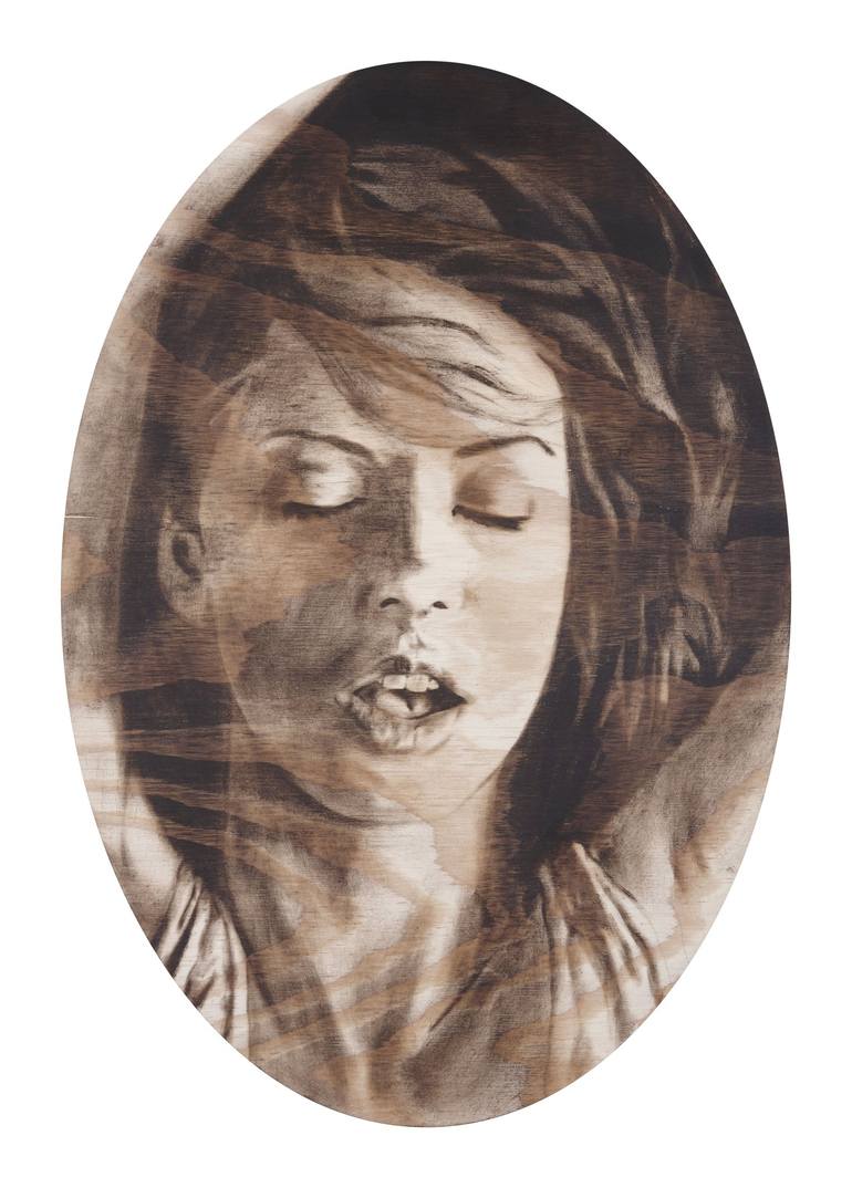 Part of a series of four paintings, O Face #3 captures emotion and passion at its most intense – and vulnerable. Painting on his signature wooden canvas, Kelly John Gough captures a woman in the throes of ecstasy, allowing the grains and knots of the wood below to add striking texture and depth to t...