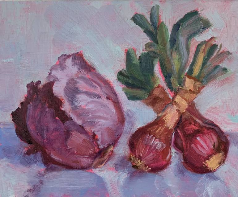 The title of this painting, O X, is derived from the composition of the painting, with the cabbage creating an "O", and the crossed shoots of the red onions creating an "X". This piece is a study in shades of violets playing off the green of the onions.