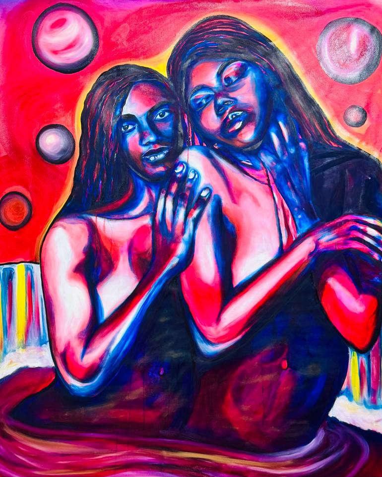 This evocative painting portrays two young women submerged in water to their waists, locked in a tender embrace. Set against the majestic backdrop of a cascading waterfall and celestial planets, the piece pays homage to the Yoruba goddesses Oba and Oshun. One figure holds the other with a quiet stre...