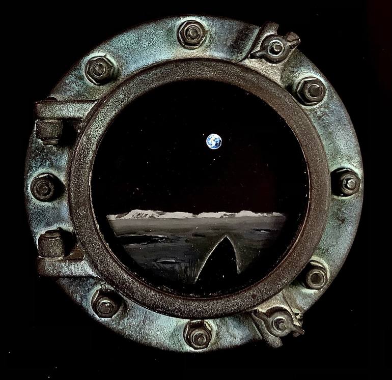 We landed on the impact melt floor of a crater on the Moon and looked back at the Earth out our porthole window. Our rocketship was now quiet, its long shadow lined by a glory of scattered light from the cloud of condensed water still enveloping the ship. I painted this scene on a 4 inch-diameter w...