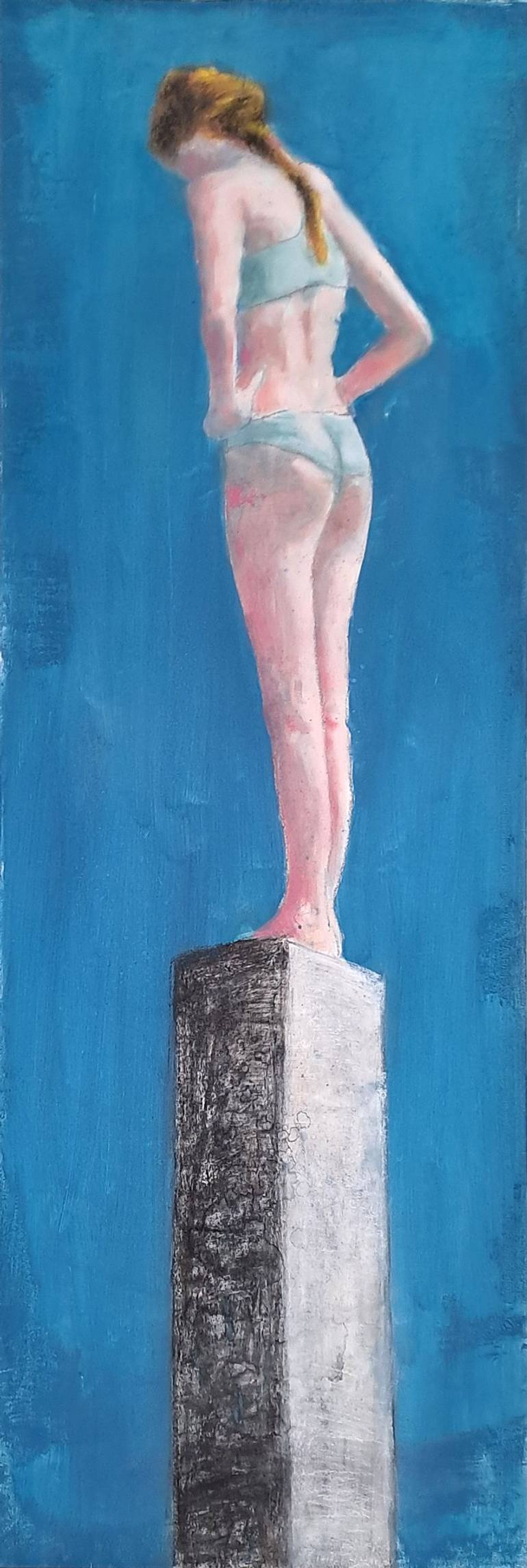 A young girl, in a fragile position on a huge piedestal,looking for something in a bluish space, maybe for an answer?