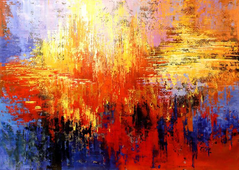 This is an original abstract painting. Due to the large size of this canvas, it will be shipped rolled in a tube. Size: 42" x 59" with 2.5" inches around the canvas for mounting ( 47" x 64" ). Sides of the canvas are painted. A protective coat of satin varnish is applied. The painting is signed on t...