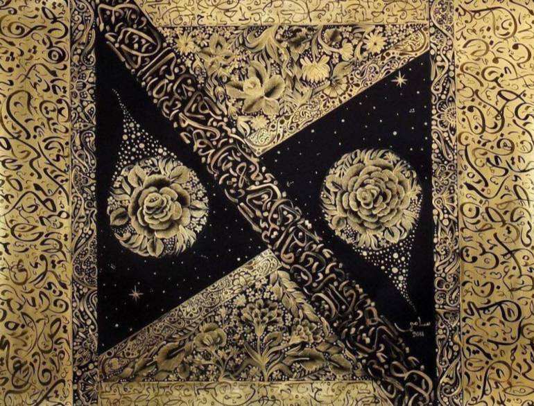 Acrylic and ink on black CANSON paper 50x65cm Abstract Arabic calligraphy, random letters without literary meanings Handwriting Henna ornaments Arabesques One stroke painting In this artwork I used 3 styles of Arabic calligraphy ( Thuluth, Diwani and Maghrebi) Upon delivery the artwork will ...