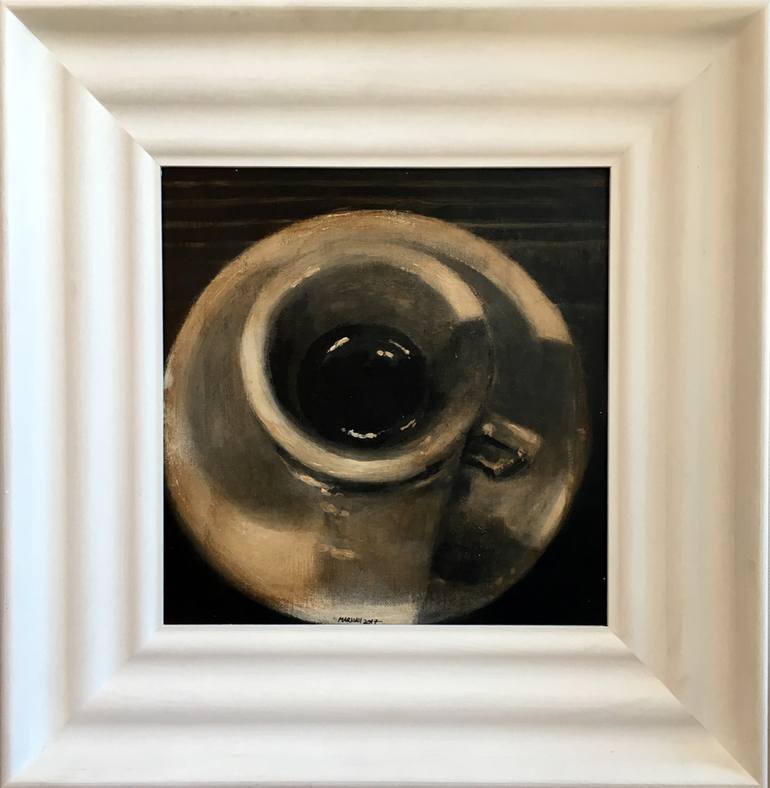 from the OSCURI serie. Urban places and home objects wrapped up by a metaphysical atmosphere. Surface finish with natural beeswax. The painting is sold with white thick frame in price.
