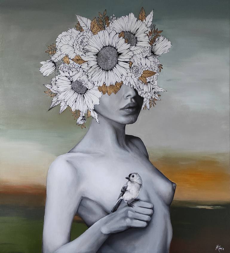 The paint tells about feelings, freedom and letting go of what's wrong. It symbolizes freedom, and the background gives peace and relief. The mixed technique combines painting with illustration, and the golden accessories in flowers enliven and dynamize the image.