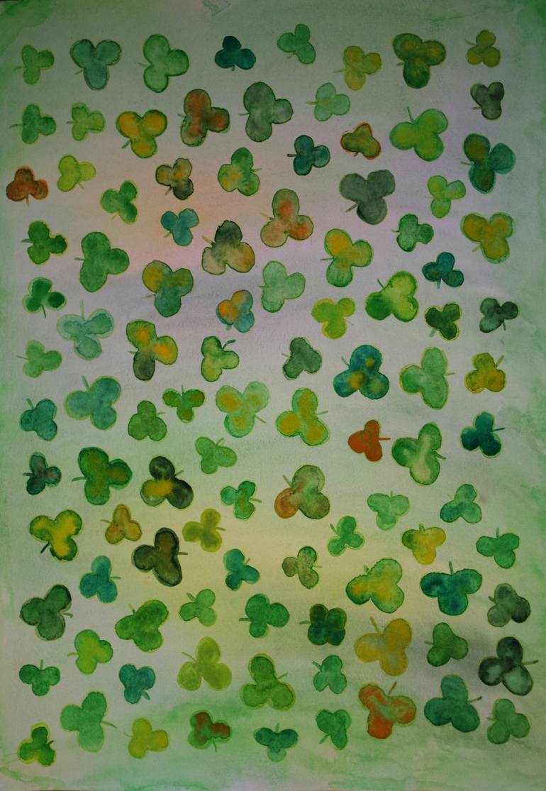 Observation test: Find a four-leaved clover in the meadow. Original watercolor painting.