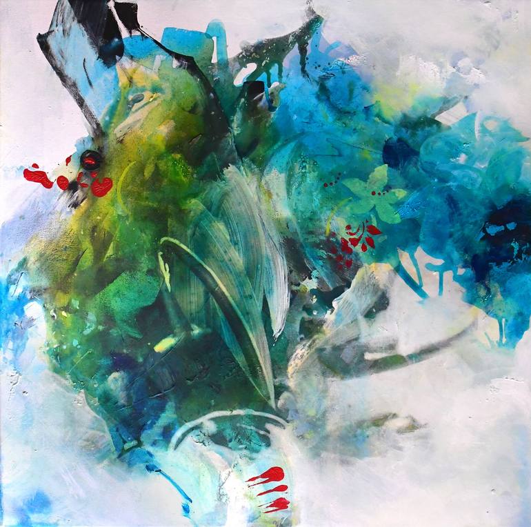 Large abstract painting ready to hang The size is 60 cm x 60 cm (23,62" x 23,62"), the canvas is 2 cm (0,78 inch) deep. The colors are dark blue, aqua-blue, dark green, yellow, spots of red and white. It’s painted on a stretched canvas, the staples are on the back and the edges are painted with th...