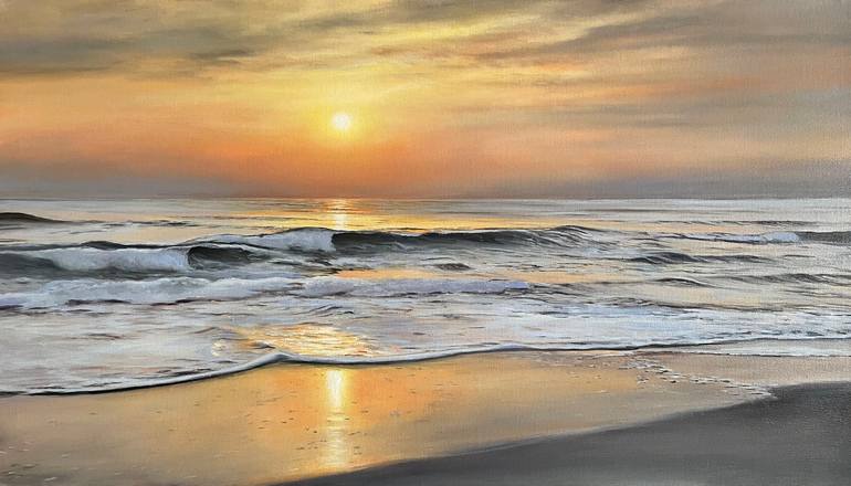 This original ocean sunrise painting, sized 48x28 inches, beautifully captures the tranquil beauty of the beach at dawn. The scene features soft, golden light filtering through the sky as the sun rises over the horizon, casting a warm glow across the rolling waves. The gentle motion of the water con...