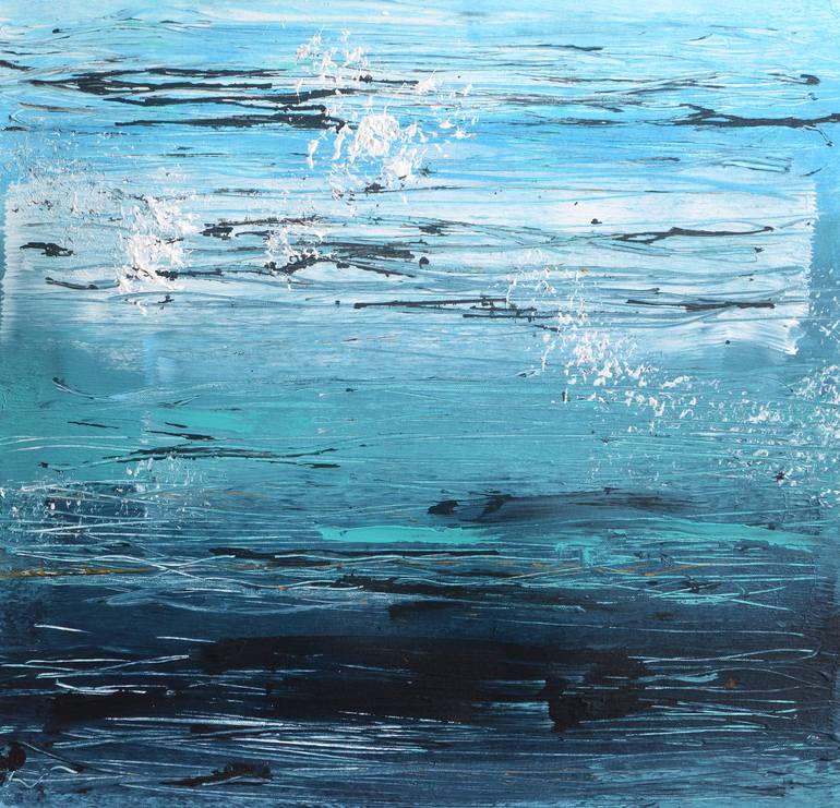 This painting is inspired by vivid landscape of the ocean. The horizon disappears in the haze. The waves are marked with smudges and lines, the blue, turquoise and black are the colours of the water and the sky. The shape is square, 50 x 50 cm or 20 x 20 inch.