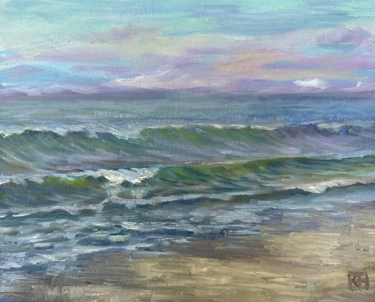Original oil painting started on location at Oceanside Harbor Beach and finished in my studio. Inspired by the California Plein Air Painters of the early 20th Century and the power and majesty of the California Coastline. Framed size 16 x 14". Framed in a nuetral gray green with gold accent.
